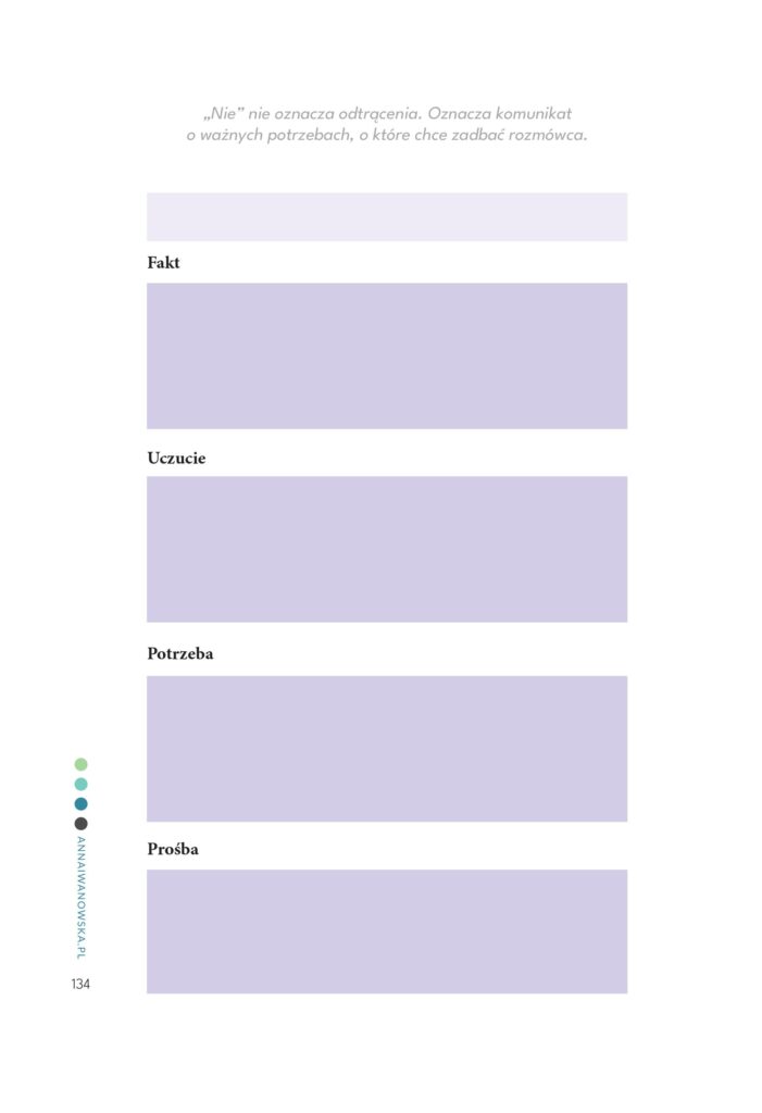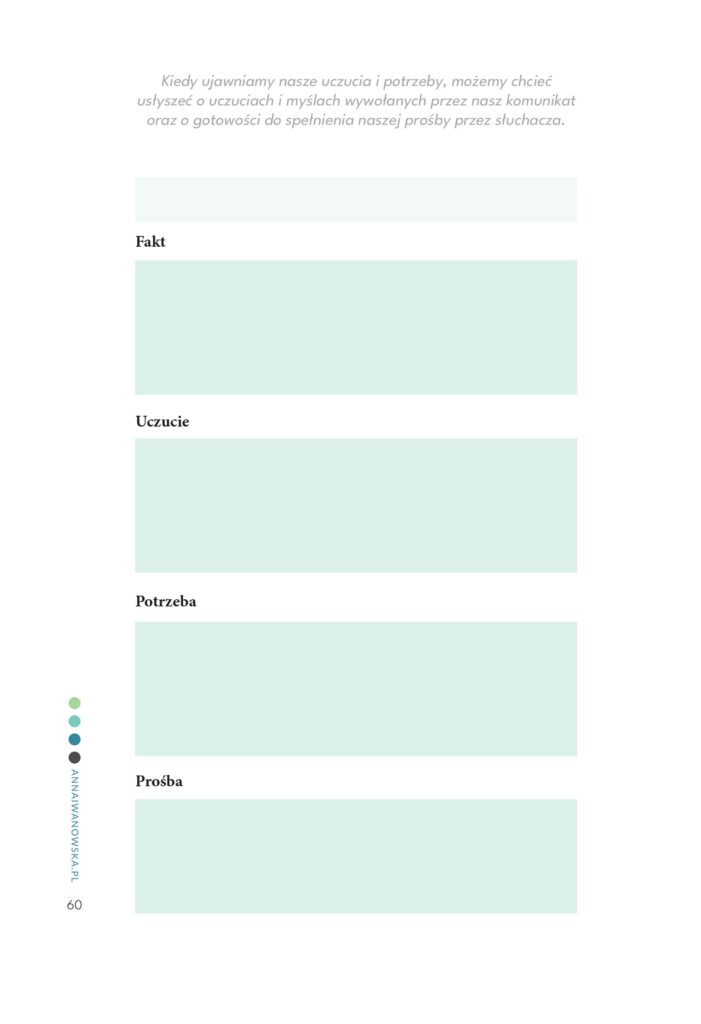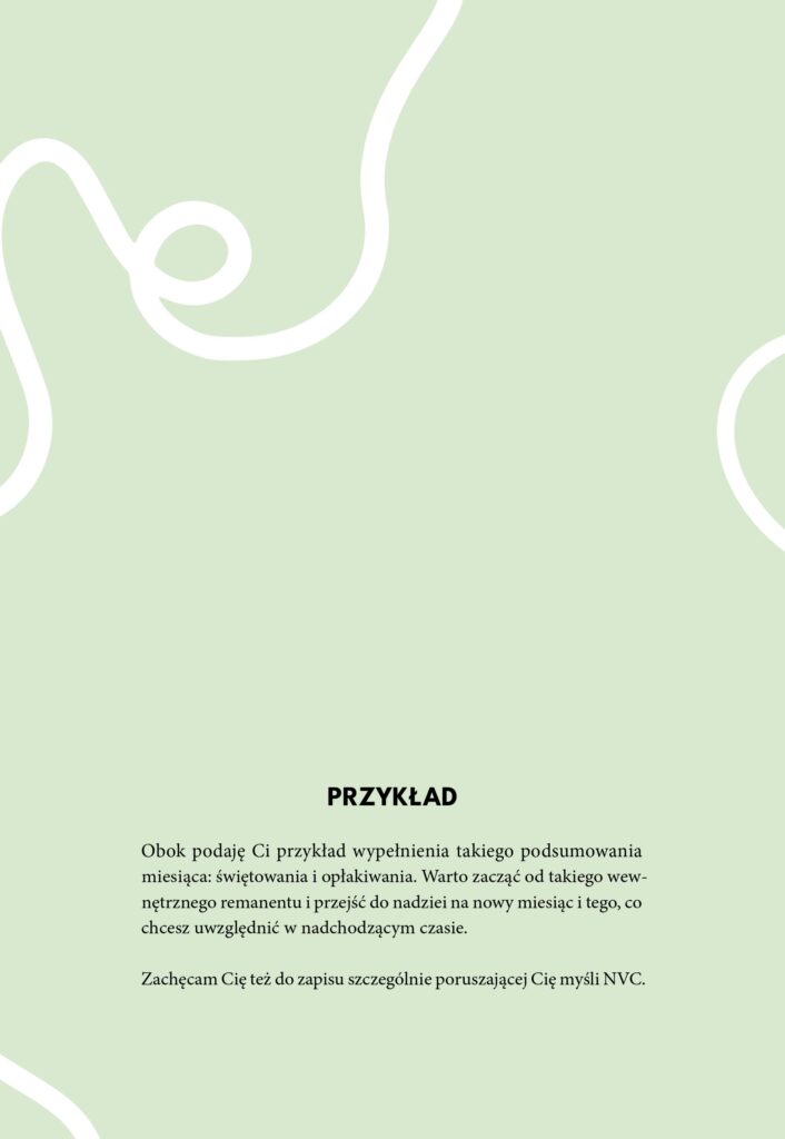 To publikacja do wypełniania TWOIM życiem. To narzędzie oparte na modelu 4 kroków Porozumienia bez przemocy (NVC). Jest zaprojektowane tak, aby pomóc Ci w lepszym porozumiewaniu się z sobą i budowaniu głębszych i bardziej harmonijnych relacji. To 6 miesięcy podróży w głąb, w świat uczuć i potrzeb.