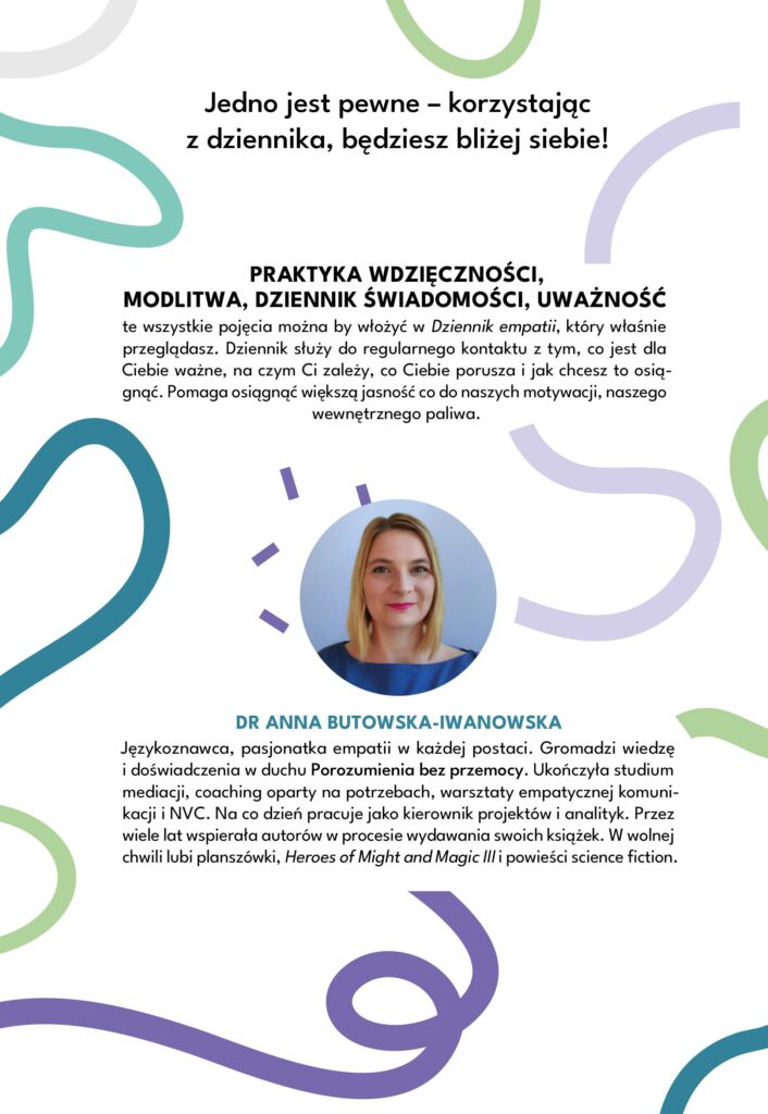 Dziennik empatii jest niezwykle pomocnym narzędziem, które opiera się na idei Porozumienia bez przemocy (NVC), zakładającym, że najpełniej żyjemy, gdy jesteśmy świadomi naszych potrzeb. Codzienne praktykowanie empatii poprzez Dziennik empatii pozwala nam lepiej rozpoznawać nasze potrzeby, bardziej świadomie odczuwać związane z nimi emocje. Forma pisemna dodatkowo pomaga nam wyrażać nasze myśli i dotrzeć do sedna tego, o co nam chodzi. Dzięki temu, będziemy w stanie komunikować się skuteczniej w naszych relacjach, co z kolei wpłynie pozytywnie na nasze samopoczucie. - Czym różni się Dziennik empatii od typowego dziennika?